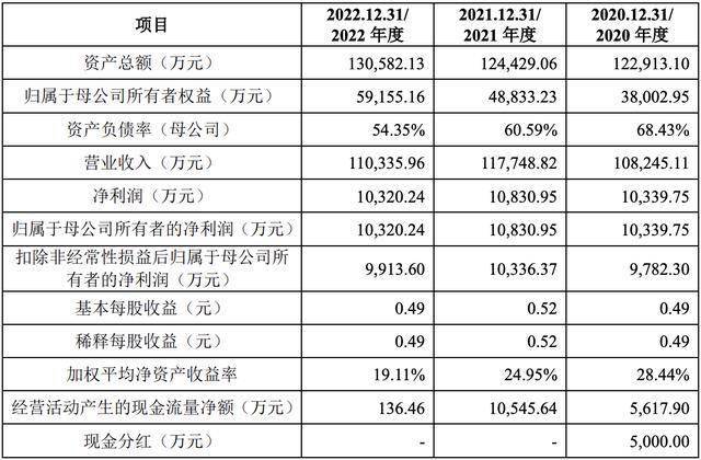 2020年、2021年和2022年,烨隆股份的营收分别约为10.82亿元、11.77亿元和11.03亿元,净利润分别约为1.03亿元、1.08亿元和1.03亿元,扣非后净利润分别约为9782.30万元、1.03亿元和9913.60万元。